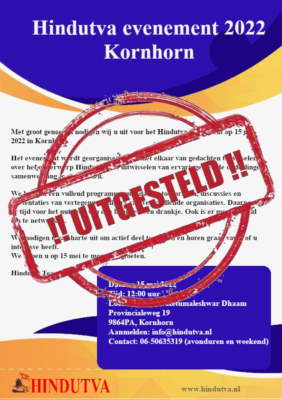 Hindutva evenement 25 februari 2022 Dit evenement wordt uitgesteld. De nieuwe datum wordt op een later moment bekend gemaakt.